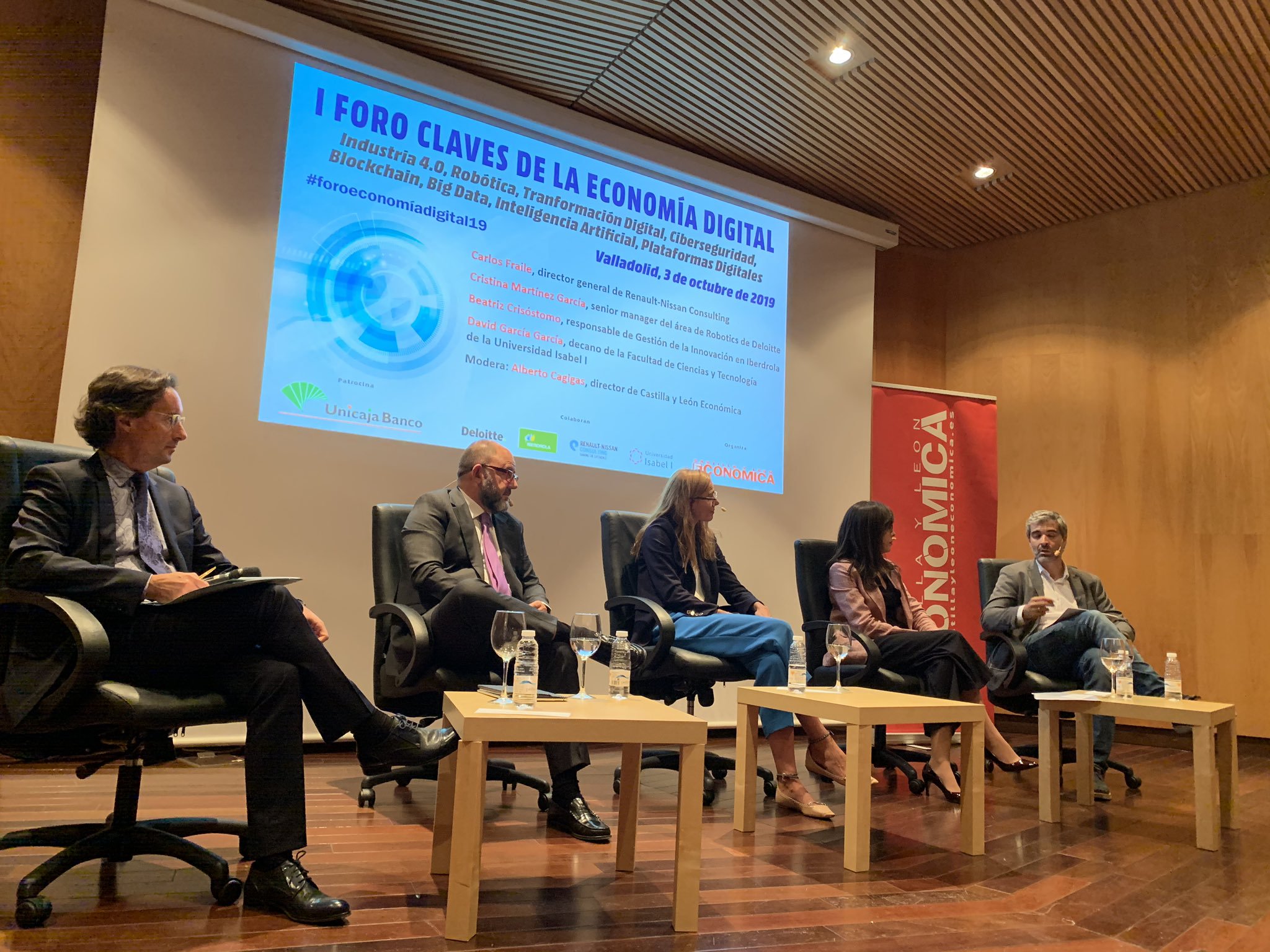 Entre los participantes de la mesa se encontraban Carlos Fraile, Director general de Renault-Nissan Consultant; Cristina Martínez García, Senior Manager del área de Robotics de Deloitte; Beatriz Crisóstomo, Responsable de Gestión de la Innovación en Iberdrola; y David García García, Decano de la Facultad de Ciencias y Tecnología de la Universidad Isabel I.